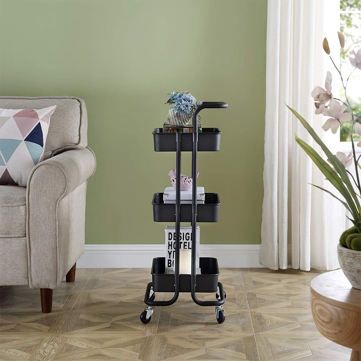 This storage rolling cart is easy storage and transportation. The versatility of the utility cart makes it a great item to have in the home, kitchen, living room, office, dorms, and other places that need extra organization.