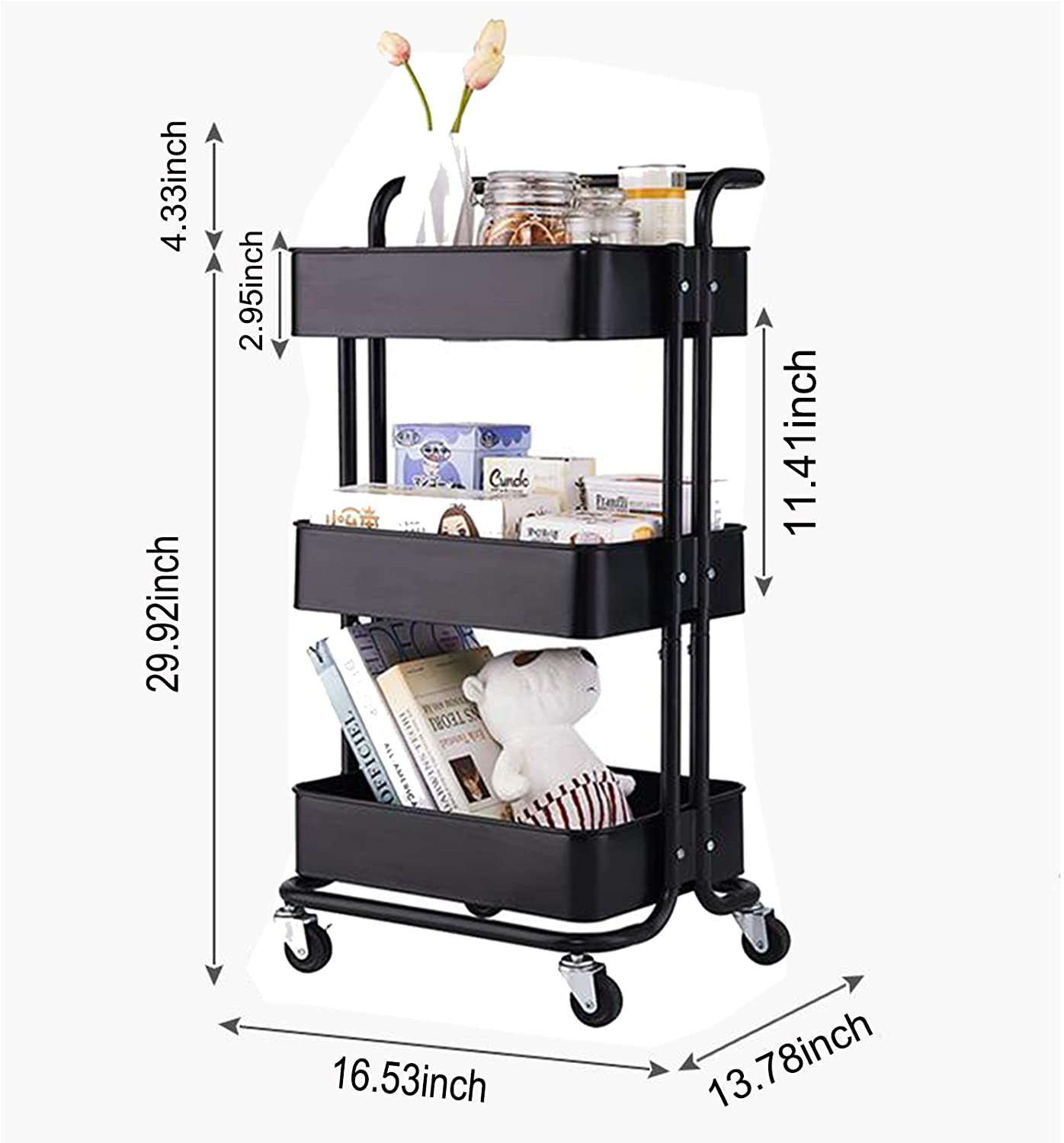 3-tier utility cart has large storage space saving your floor space to optimize the space utilization as much as possible; a great storage solution for narrow space, room corner, and small kitchen.