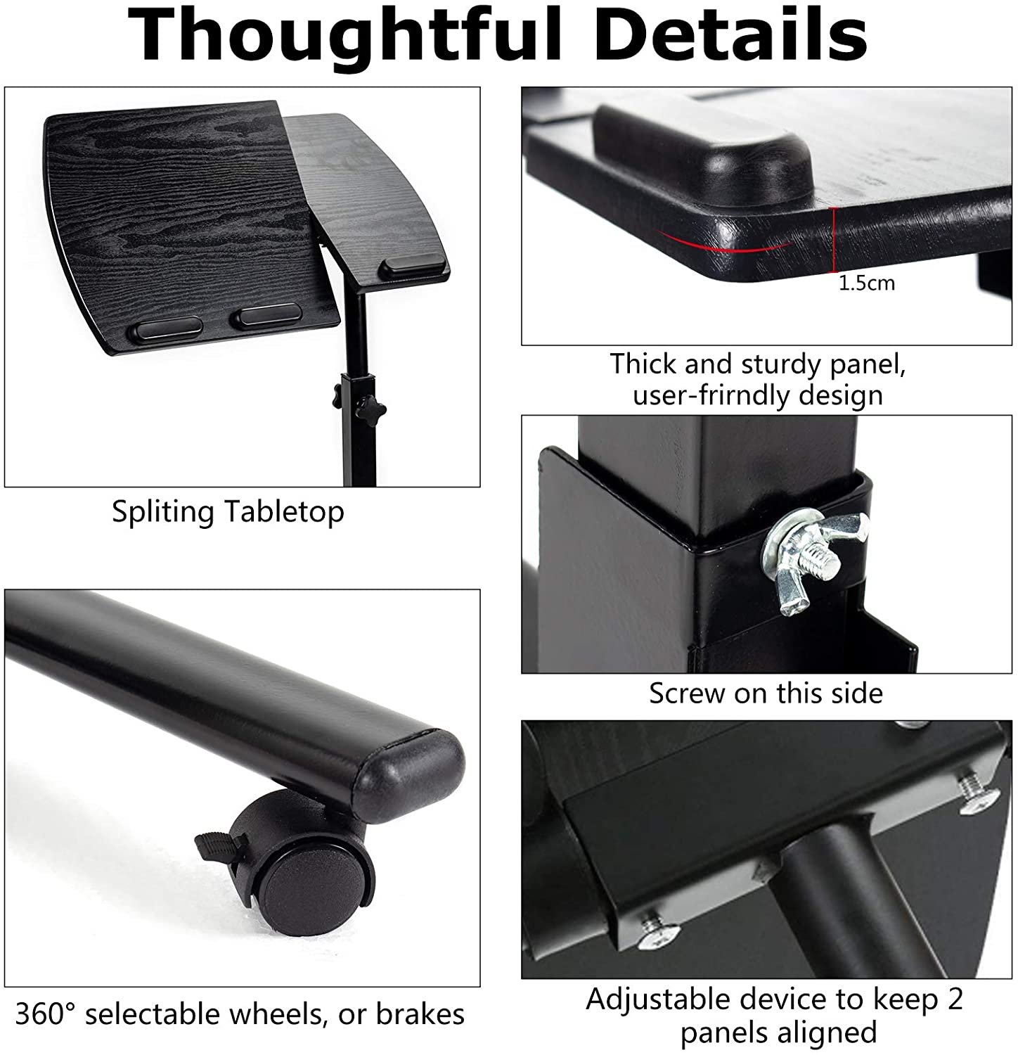 Easily adjust the height of this table from 65cm to 95cm, 360¡ã swivel and 180¡ã tilting of the splitting tabletop. Rolling Casters with locking mechanisms bring you much convenience and comfort.