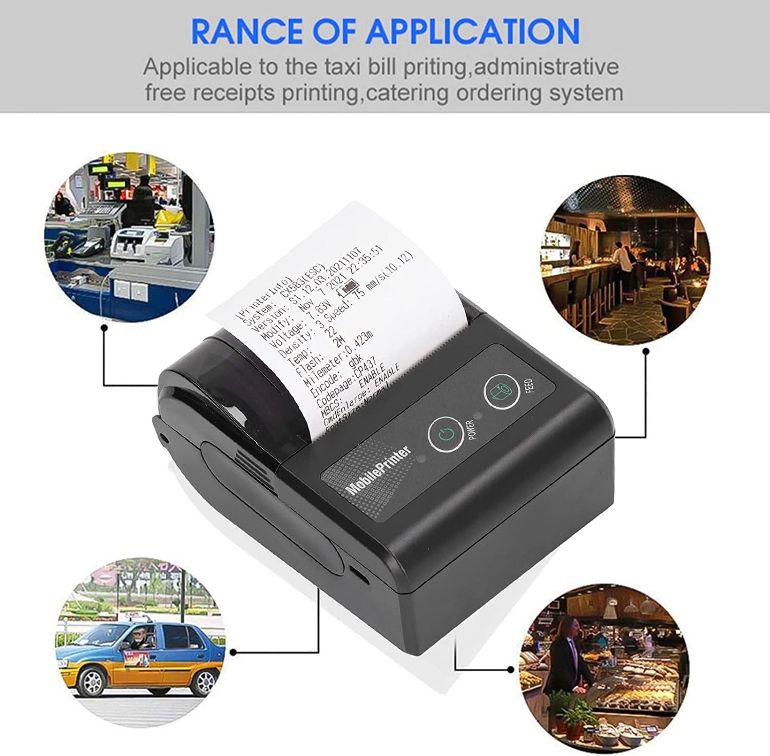 Receipts printer is suitable for taxi order printing, free receipt printing, food ordering system, office printing, high speed and clear printing, suitable for Restaurant Retail, Sales, Kitchen, Hotel,etc.